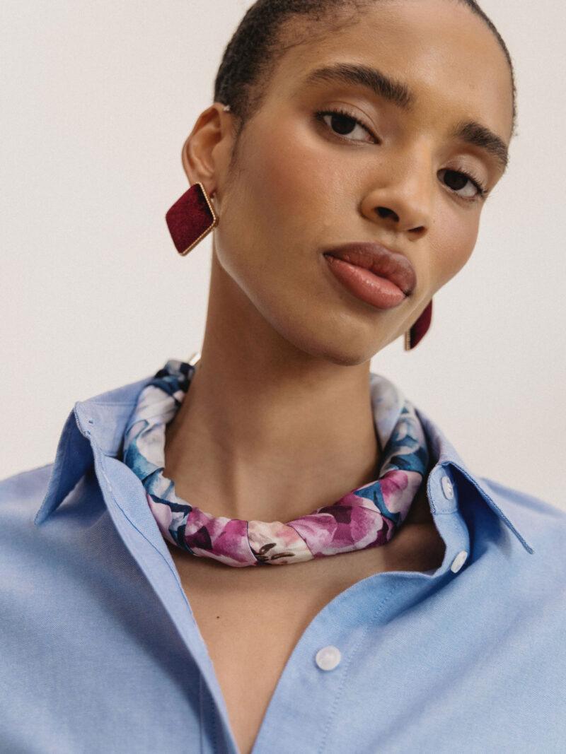 Με αποχρώσεις που αντανακλούν τη χαρά των γενεθλίων, αυτό το μεταξωτό μαντήλι μπορεί να φορεθεί ως κομψή μπαντάνα με την μυτερή άκρη του τοποθετημένη στο πλάι.