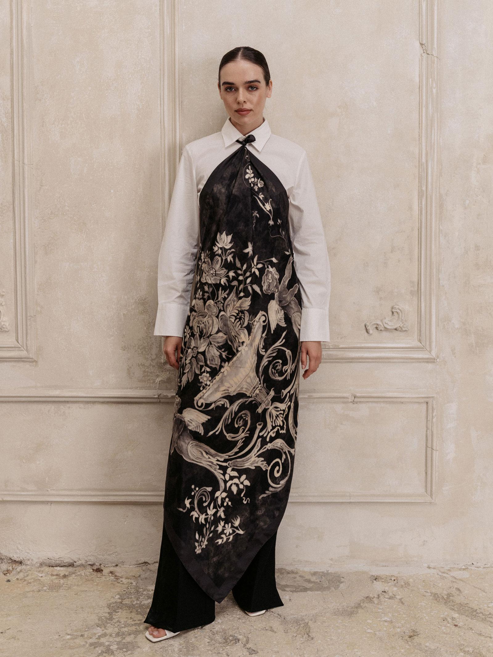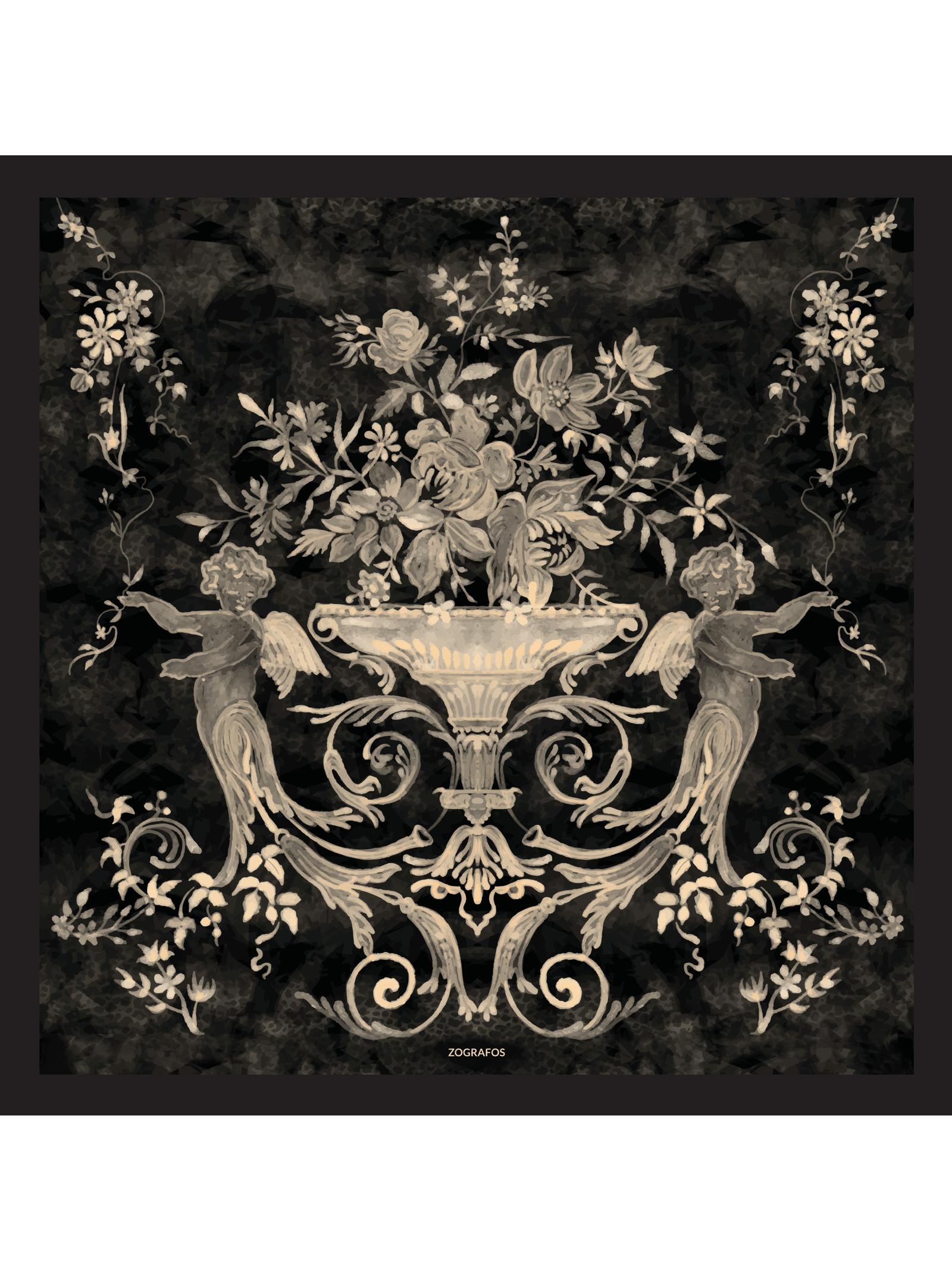 Σε μια λυρική ισορροπία ανάμεσα στο αθώο και το μυστηριώδες, το μεταξωτό μαντήλι Savage αποκαλύπτει ένα ντουέτο αγγέλων μέσα σε έναν μαγεμένο κήπο που ανθίζει πάνω σε σκοτεινό φόντο.