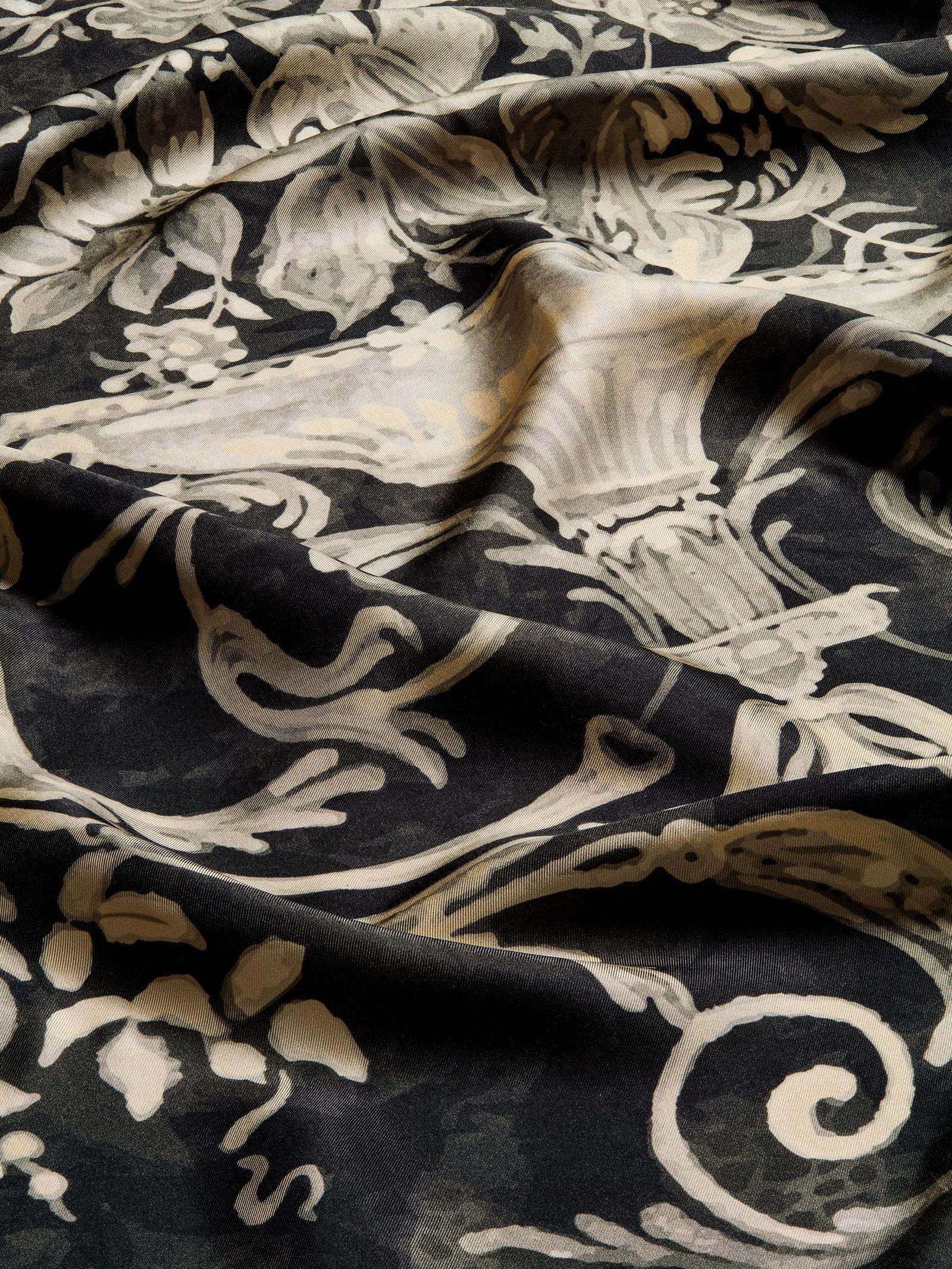 Με μια σύνθεση ρετρό μπεζ αποχρώσεων επάνω σε ένα δραματικό μαύρο φόντο, αυτό το μεταξωτό μαντήλι μπορεί να φορεθεί ως μια εντυπωσιακή ποδιά πάνω από ένα σύνολο, στερεώνοντας τη μία άκρη του σε ένα κολιέ και δένοντας τις δύο άλλες άκρες πίσω στη μέση.