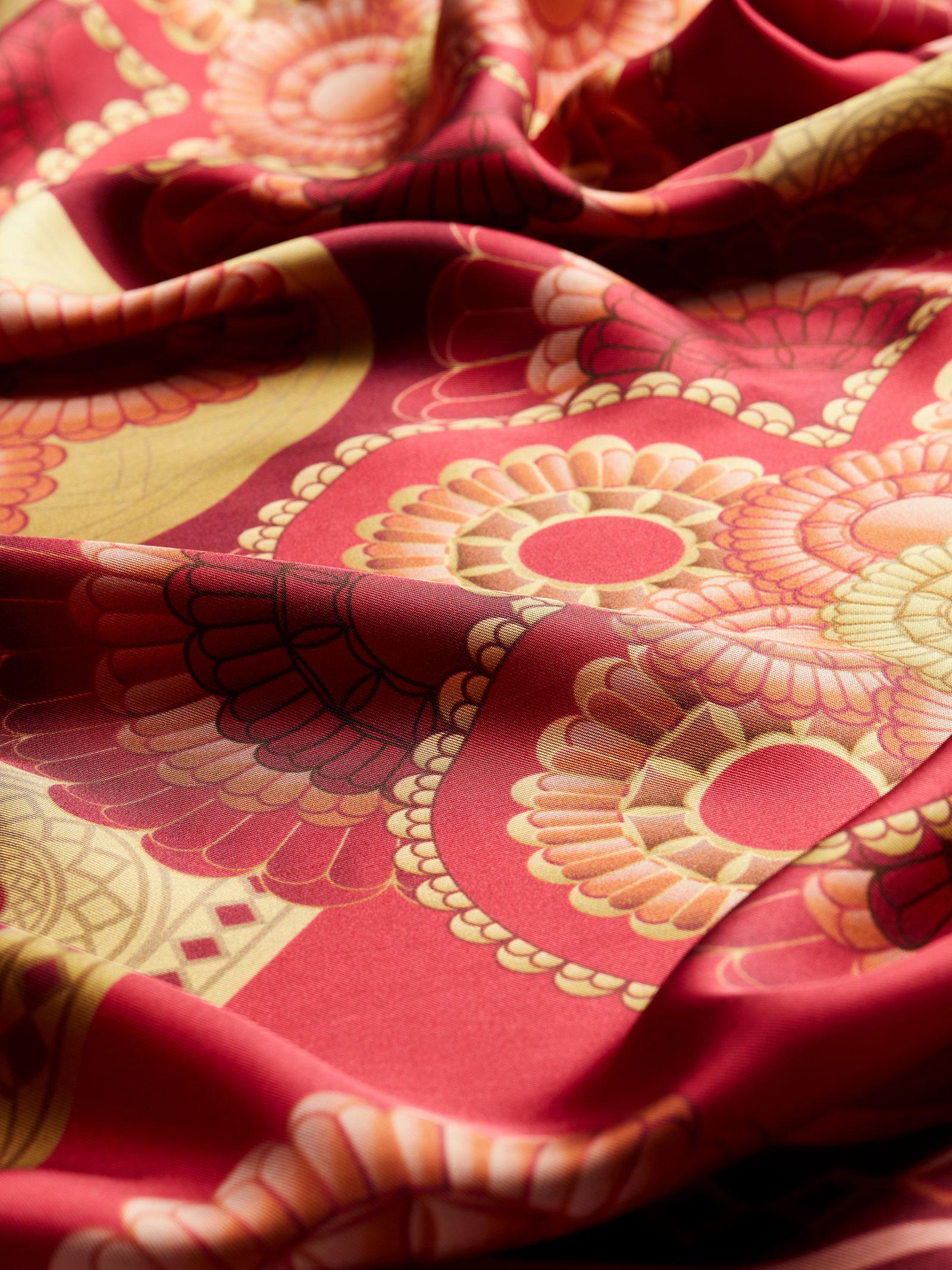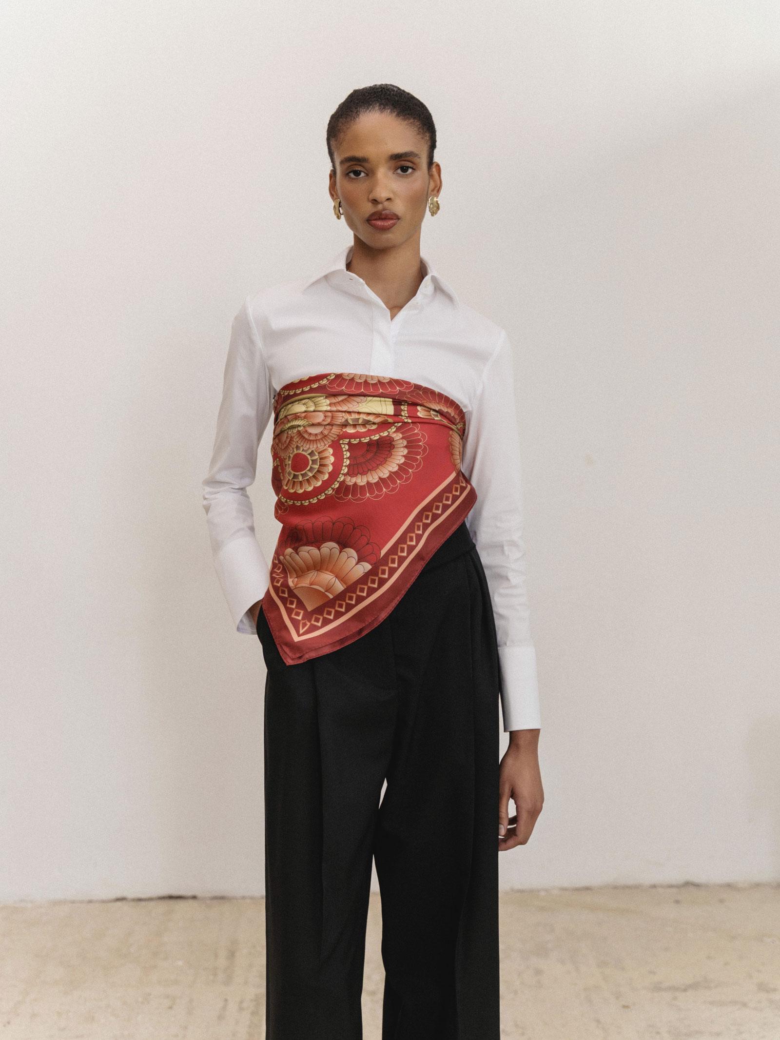 Διακοσμημένο με μοτίβα εμπνευσμένα από τον Ινδικό Λωτό, σε παθιασμένες κόκκινες και χρυσές αποχρώσεις, το μεταξωτό μαντήλι Soraya μπορεί να φορεθεί εναλλακτικά ως ένα strapless πάνω από ένα κλασικό πουκάμισο.