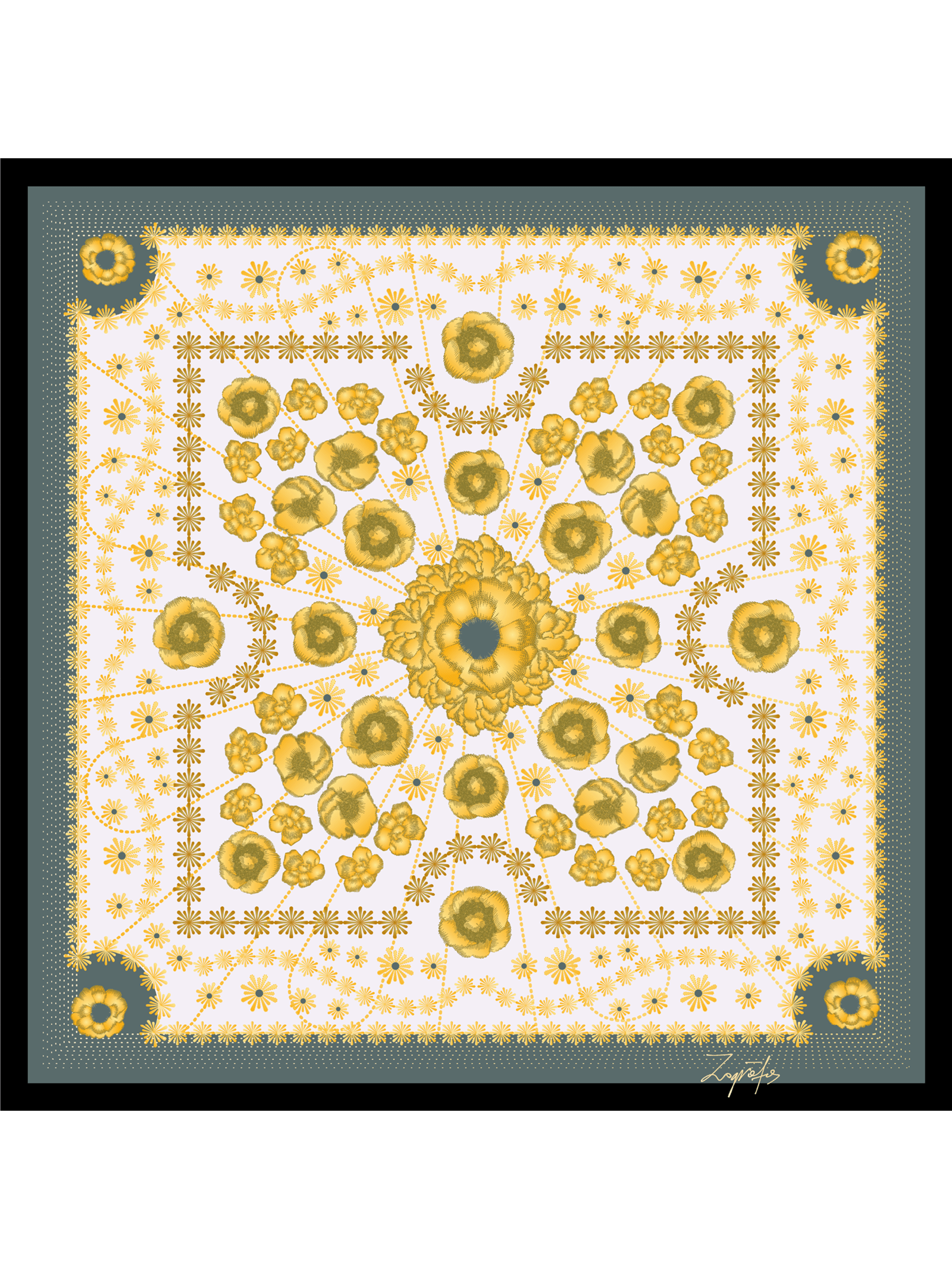 Αντλώντας έμπνευση από την παραδοσιακή φορεσιά της Καρπάθου, αυτό το μαντήλι απεικονίζει ένα μπουκέτο λουλουδιών που παραπέμπει στα πληθωρικά κεντήματα που κοσμούν τα τελετουργικά κεφαλομάντηλα του νησιού.
