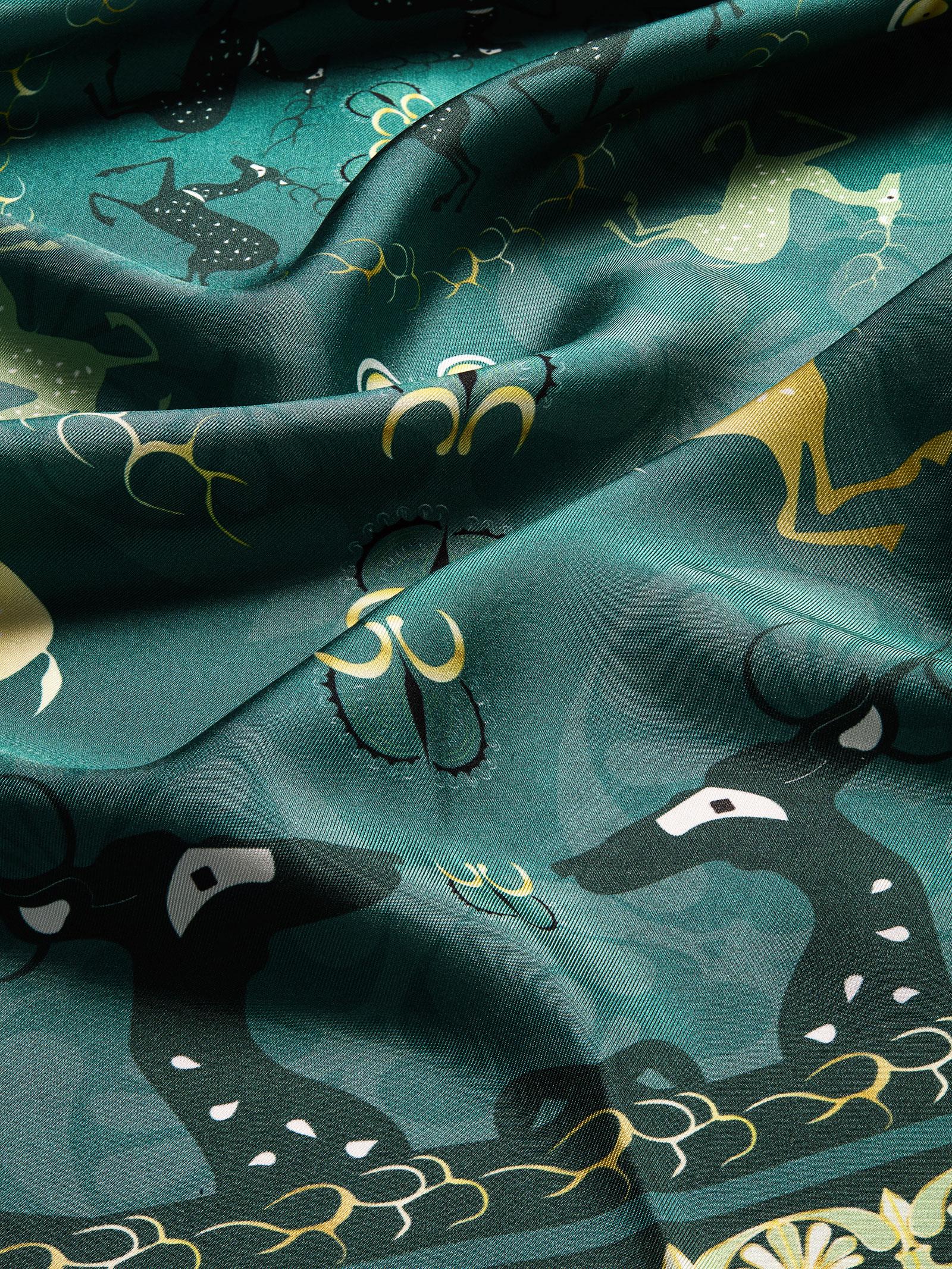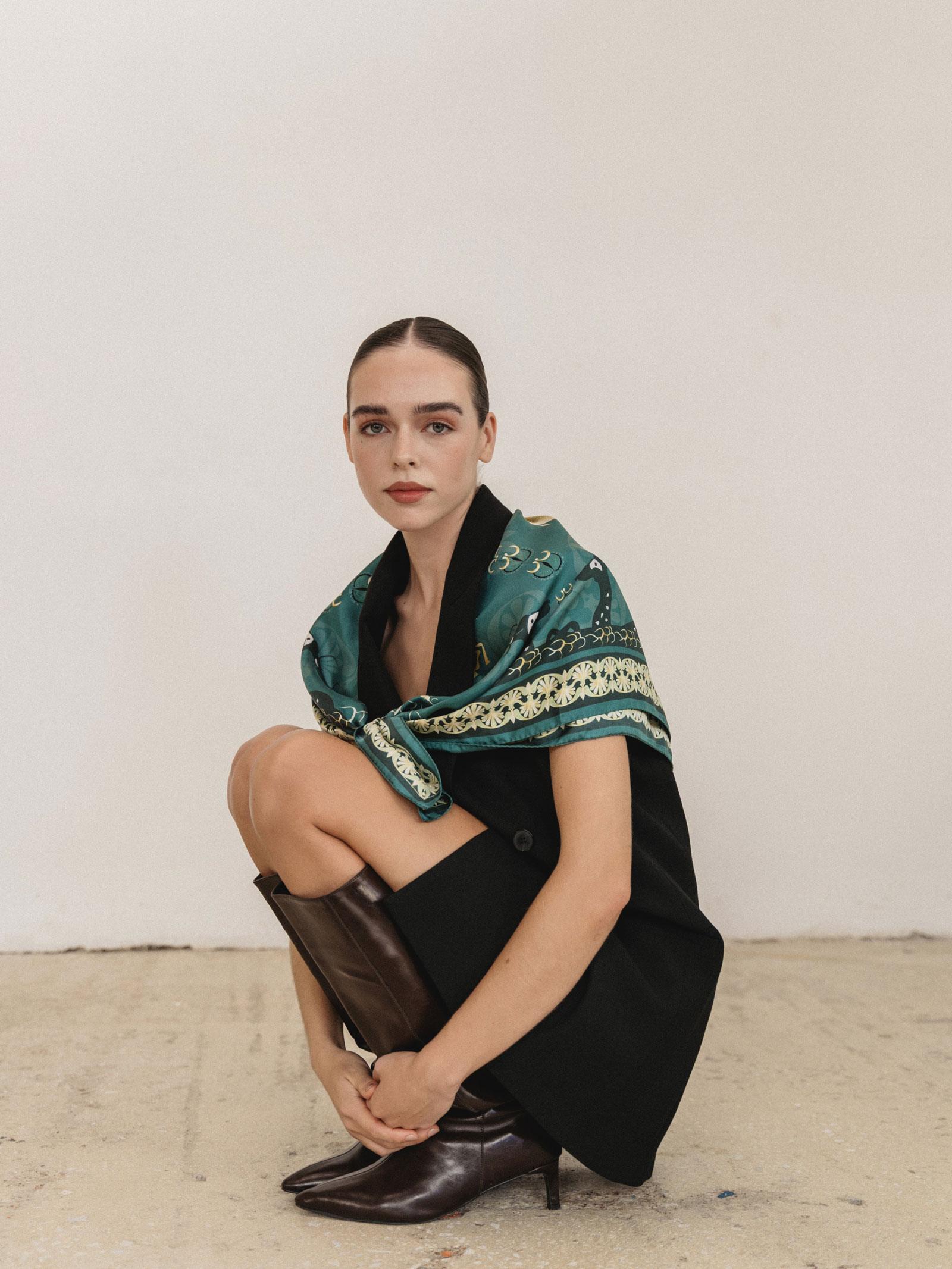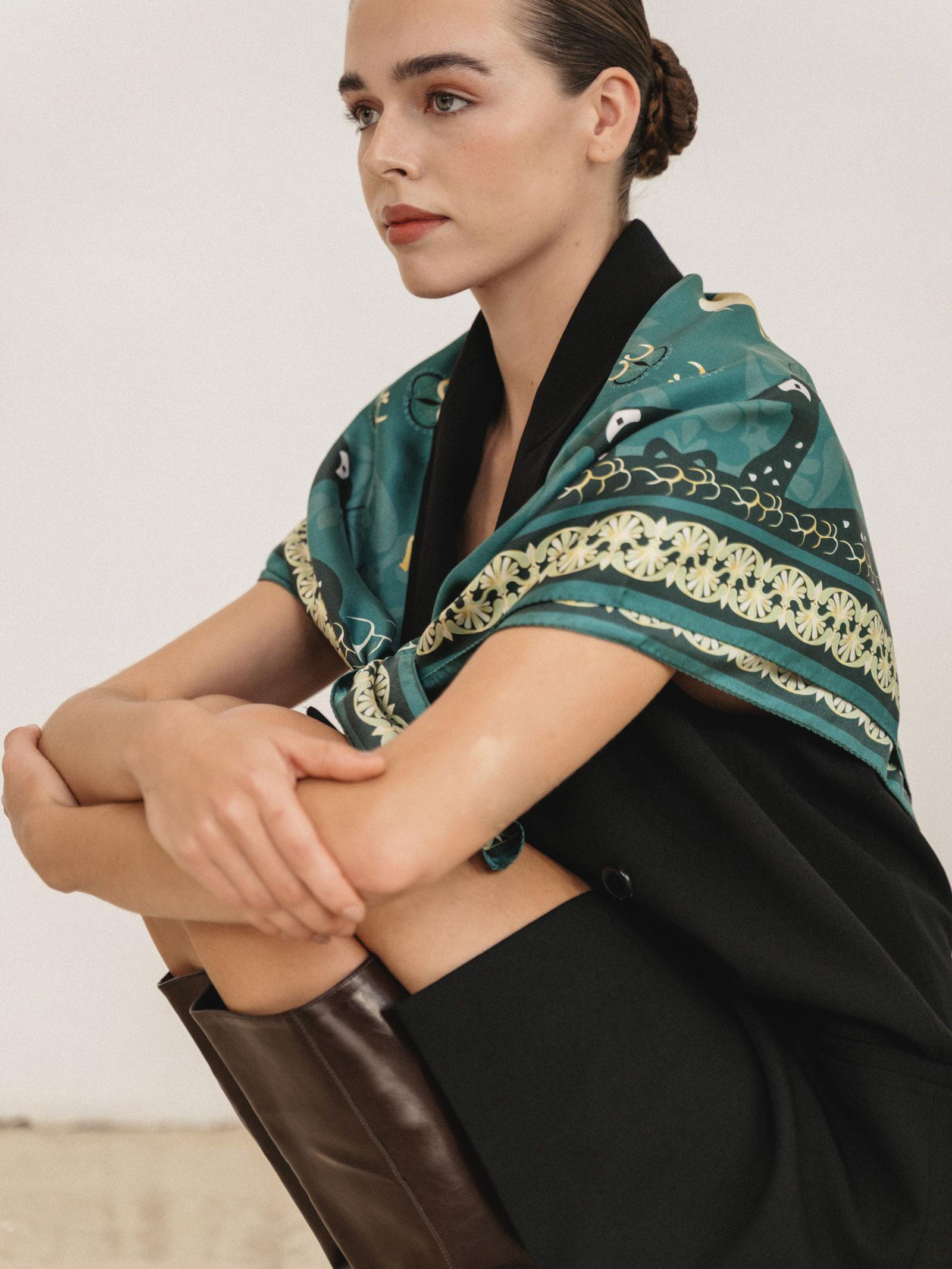 Με μια πλούσια σύνθεση από πράσινους και χρυσούς τόνους, το μεταξωτό μαντήλι Arcadia μπορεί να αφεθεί πάνω στους ώμους και να δεθεί σε έναν χαλαρό κόμπο μπροστά.