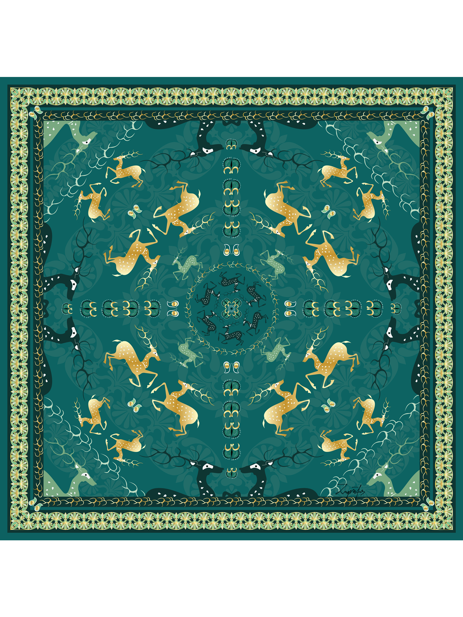 Ο Κερυνίτιος έλαφος, το θρυλικό ιερό ελάφι της Άρτεμης, με τα χρυσά κέρατα, τα χάλκινα πόδια και την υπερφυσική ταχύτητα, γίνεται πηγή έμπνευσης για το μεταξωτό μαντήλι Arcadia, αντιπροσωπεύοντας την αγνότητα και την προστασία της φύσης.