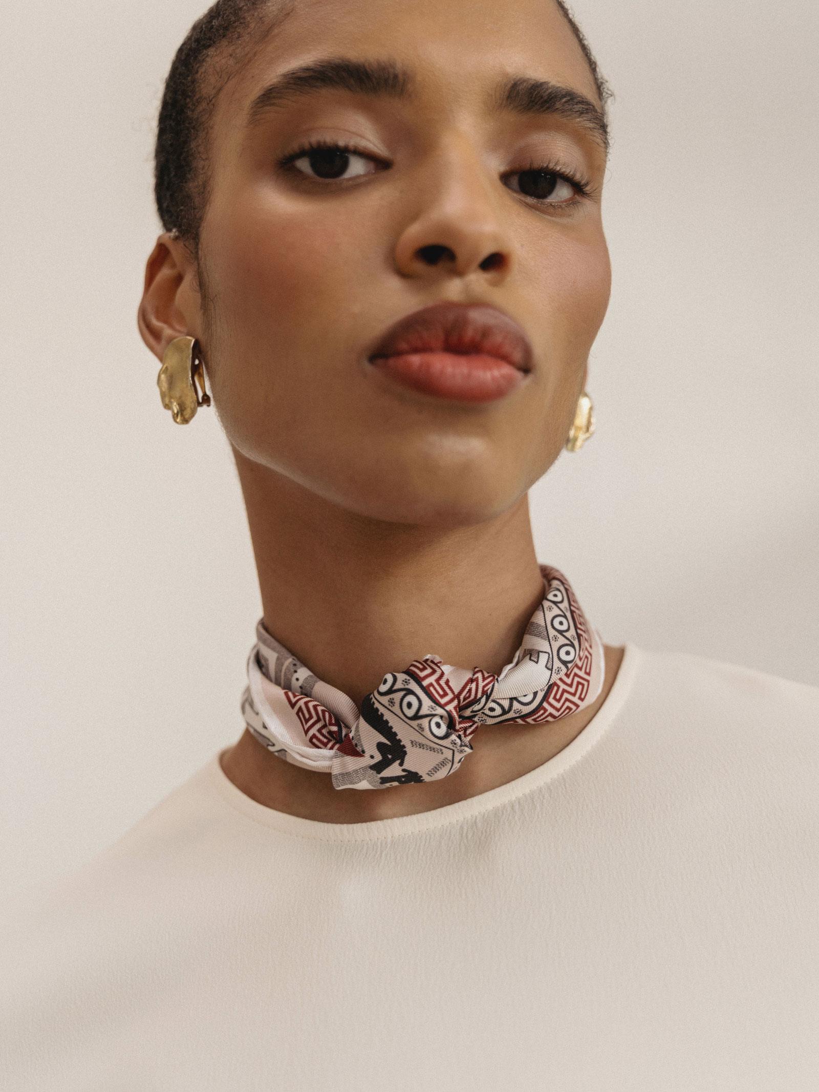 Με μια ενδιαφέρουσα σύνθεση από σκονισμένο ροζ, μαύρο και λευκό, το μεταξωτό μαντήλι Troy μπορεί να μετατραπεί σε ένα κομψό choker, δημιουργώντας έναν κόμπο στο κέντρο του και τυλίγοντάς το γύρω από τον λαιμό.