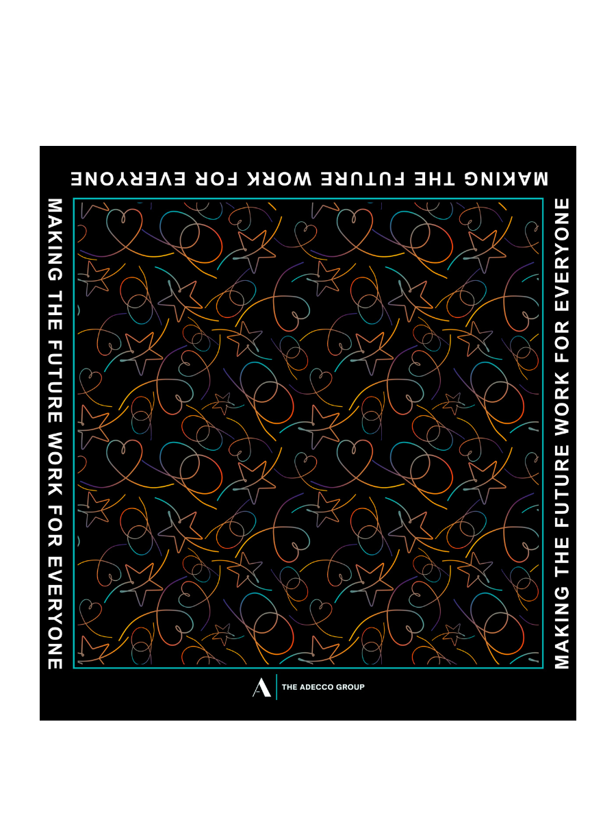 For Adecco Company, we designed two distinct scarves, using the brand’s color palette as well as its motto, ‘Making the future work for everyone.’ Additionally, we drew inspiration from the brand’s core values courage, heart, and inclusionso that these principles are reflected in the design in a way that embodies the company’s philosophy and identity.